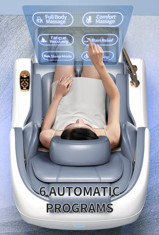 Discover the Comfort Pod - A60, a haven of relaxation with 6 tailored automatic programs. Wrapped in serene hues, it offers a full-body air massage, dual heating in lumbar and calf areas, and a unique music synchronization feature. Its zero-gravity sensation and intuitive touch screen control provide a luxurious, personalized massage experience. Dive into a world of tranquility with the A60, where every session is an escape to comfort.